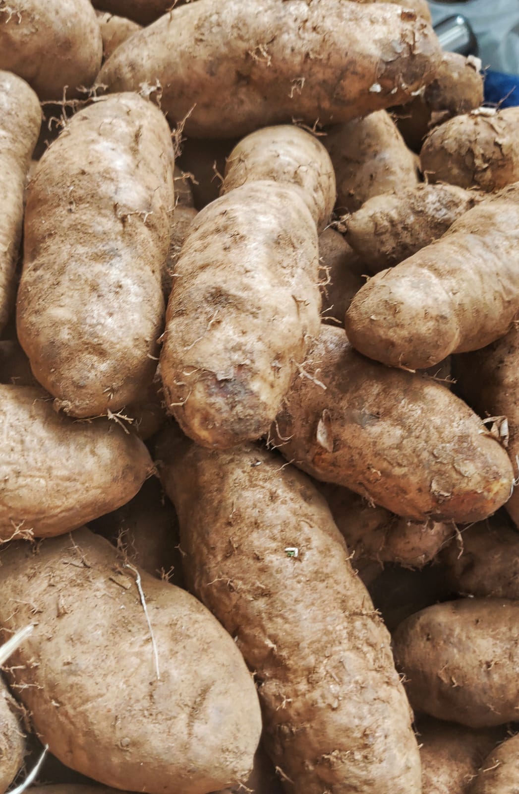 It is long like a sweet potato. Size varies from 2-6inches.